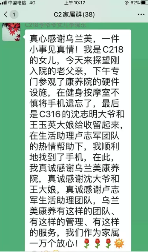 考慮到失主丟失財物焦急的心情,沈爺爺用餐過后便立即回到房間,正打算挨家挨戶找尋失主時,碰到了前來尋找手機的C區(qū)二樓生活助理團隊們。“真的特別謝謝大家的熱心幫助,當烏蘭美的護士和生活助理人員知道我的手機丟失后,都自發(fā)的幫我找尋手機。我真的感到特別的暖心,特別的貼心。經(jīng)過這次事情,我對我老父親住在這里一萬個放心!因為這里的工作人員不僅細心呵護、照顧老人,還守護了他們的財產(chǎn)安全。”